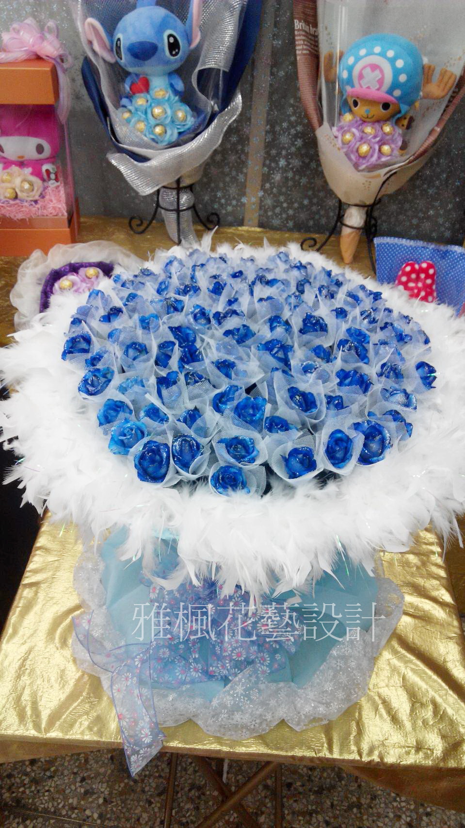 產品內容:A1-A2等級99朵藍色玫瑰_羽毛_緞帶_紗網_包裝紙 ..等
