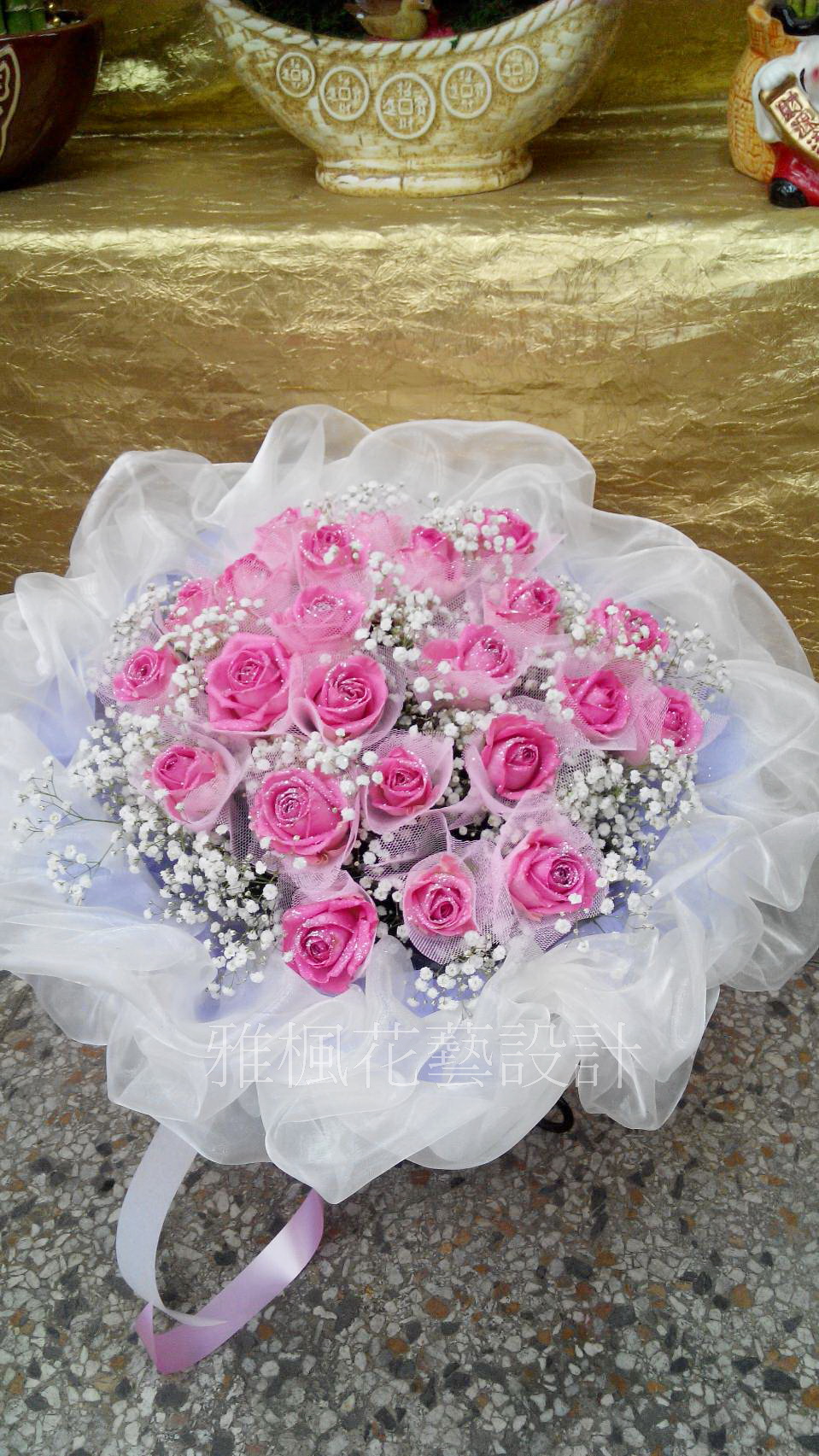 23朵紫玫瑰.滿天星.紗網.緞帶.....等