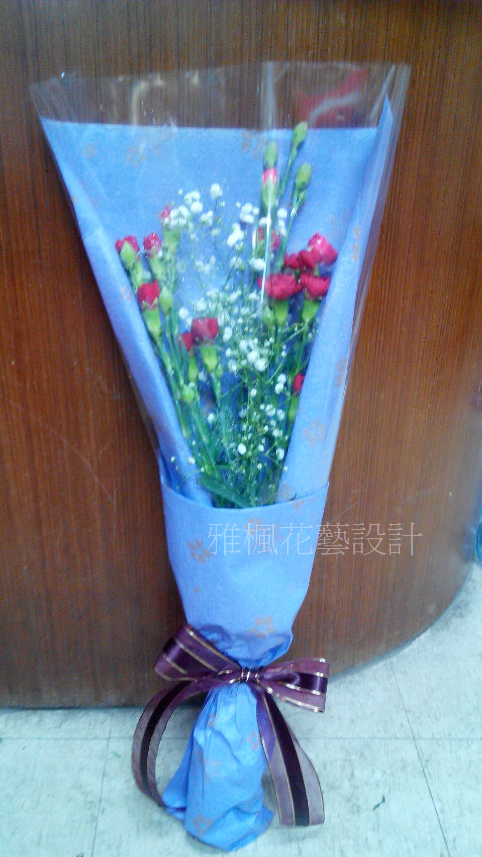 圖片中的花束是由設計師依產品圖片,手工作完成,包裝紙緞帶和