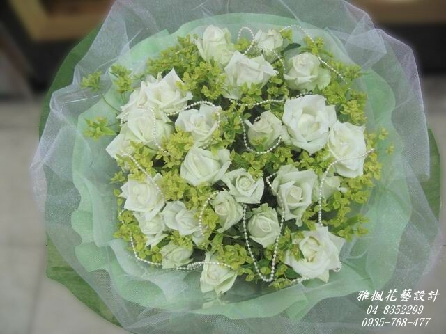 白色玫瑰花22朵,黃色小花,珠串,緞帶,紗網,高質感包裝紙