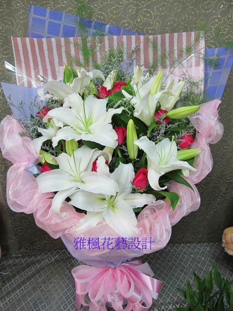 白色百合,玫瑰,卡司比亞,新文竹,緞帶,紗網,高質感包裝紙
