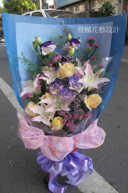 桔梗_玫瑰_夢幻百合,卡司比亞,葉材,進口紗網、緞帶,高質感包裝紙