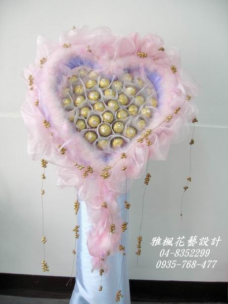 金莎巧克力36顆,特大愛心、羽毛、珠串、鍛帶,愛心、羽毛 顏色可依客戶喜愛搭配