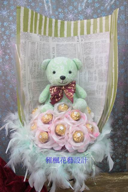 產品編號:BD061_售價:2000元 金莎巧克力10顆,蕾絲熊熊玩偶,高質感包裝紙,羽毛,紗網,緞帶
