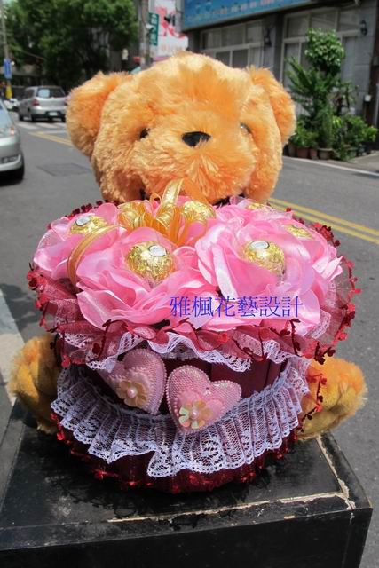 金莎巧克力10顆,大熊熊玩偶,高質感包裝紙,蕾絲,心型裝飾,紗網,緞帶