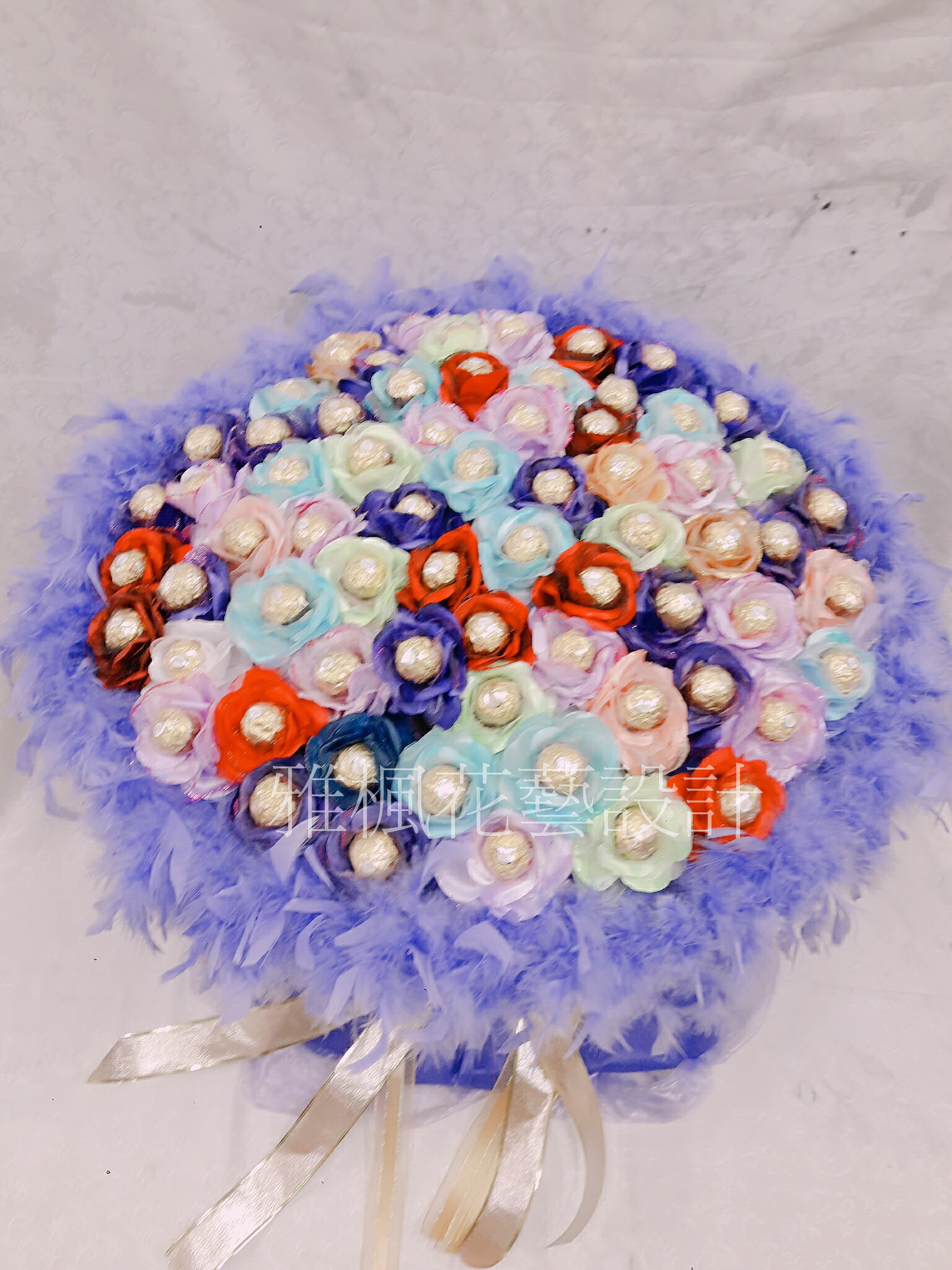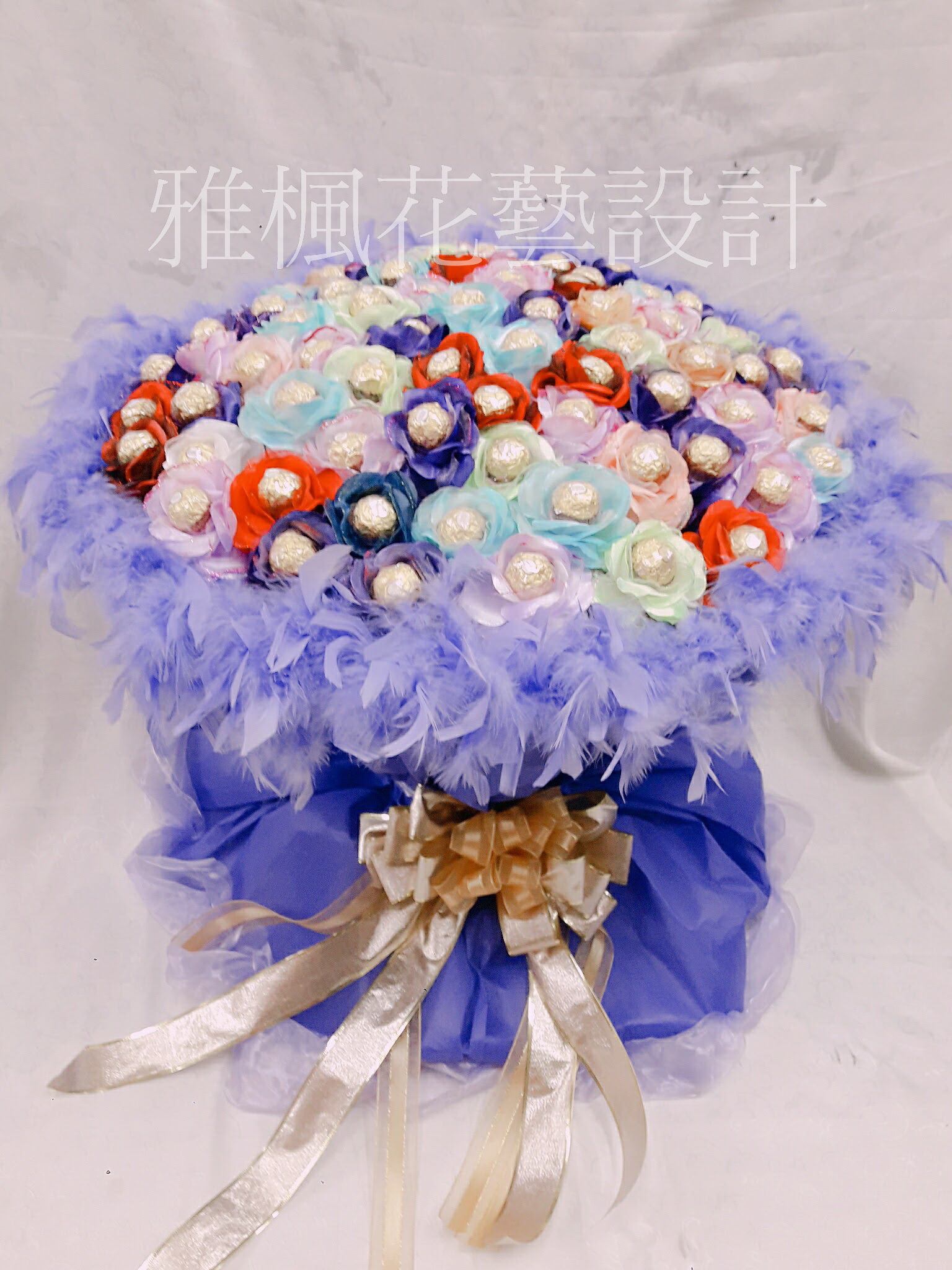 產品內容:金莎巧克力66顆,羽毛,紗網,緞帶,高質感包裝紙
