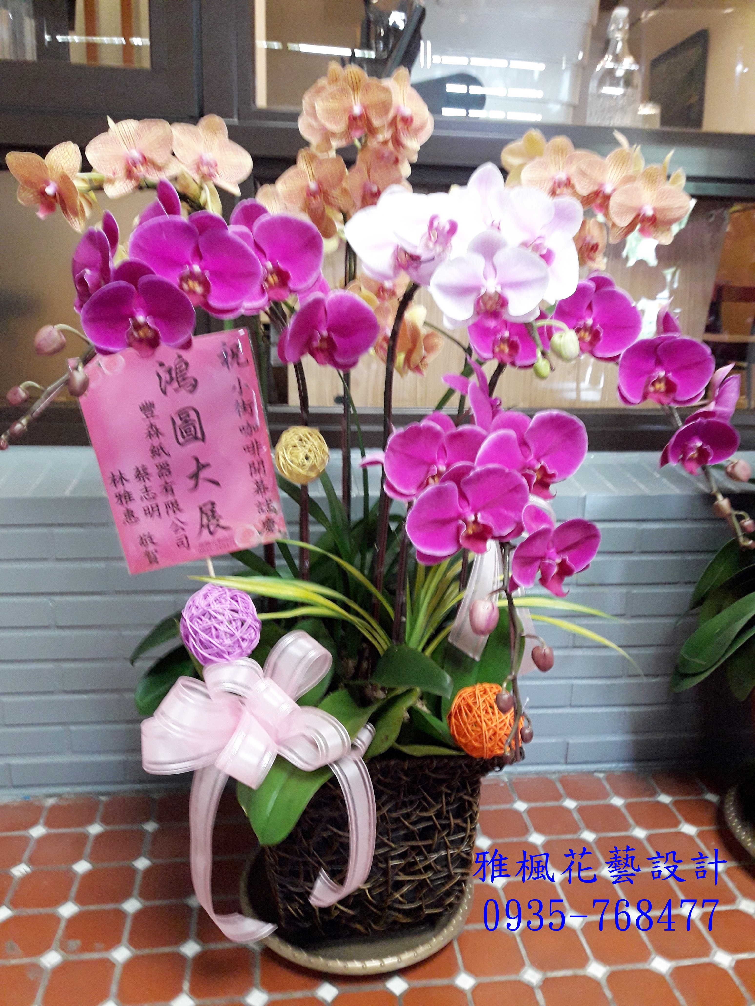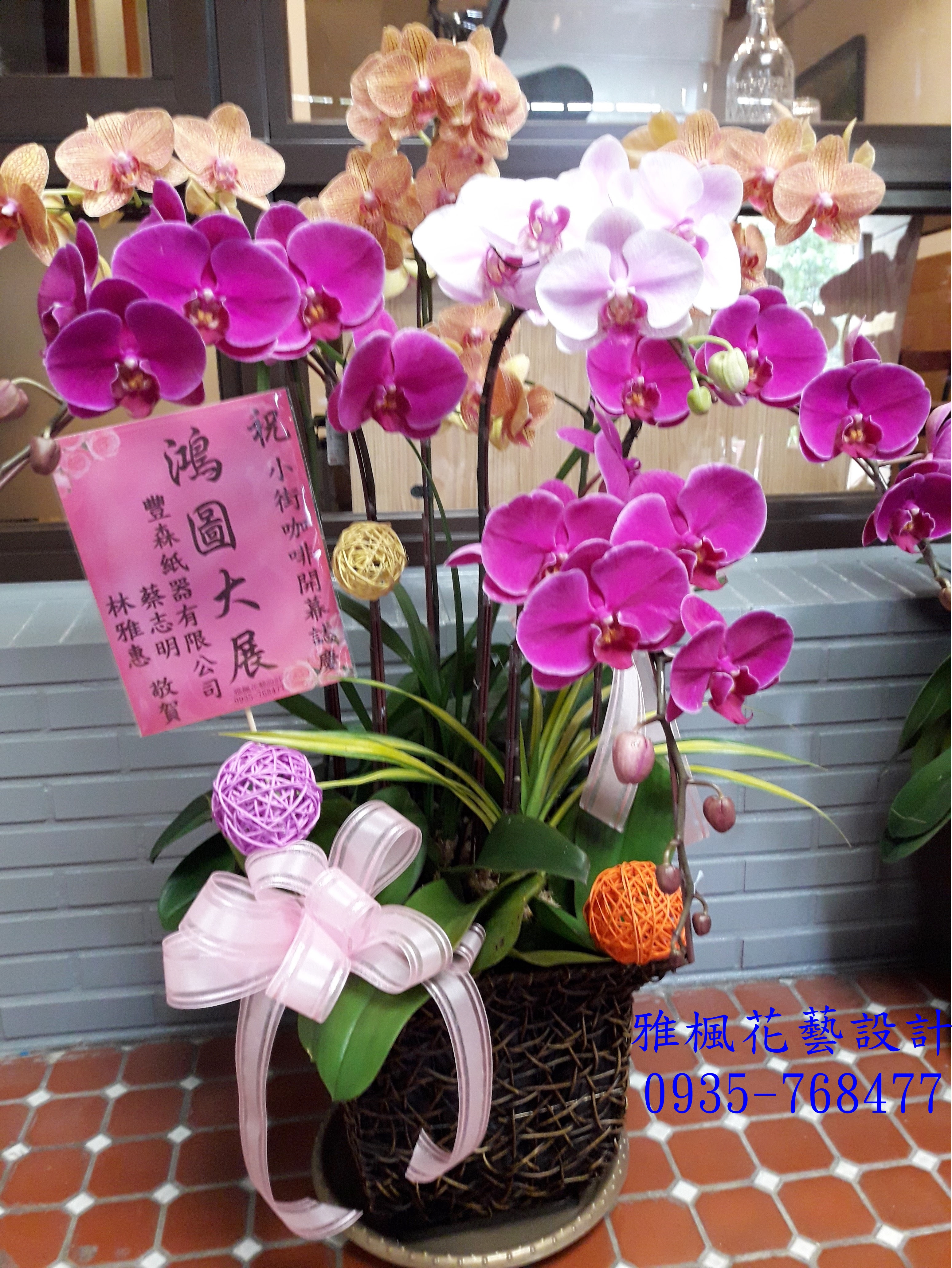 圖片中的作品是由設計師依產品圖片手工作完成,規格和質感相似。如要求100%產品圖相似度的顧客請勿訂購。圖片中蘭花品種與顏色如短缺,將以當季類似品種替換。花盆(器)籃子,配飾用品遇缺貨時,將以適當的容器,配飾用品替代使用。如有對於此產品相關問題,可直接電話聯絡04-8352299&0935-768477&0920-768477謝謝!!台中烏日區花店展覽祝賀蘭花台中大肚區花店_台中霧峰區花店同事榮升榮調送蘭花盆栽台中龍井區花店