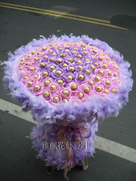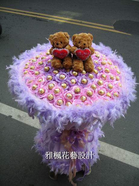 金莎巧克力99顆,熊熊一對,高質感包裝紙,羽毛,紗網,緞帶,珠串