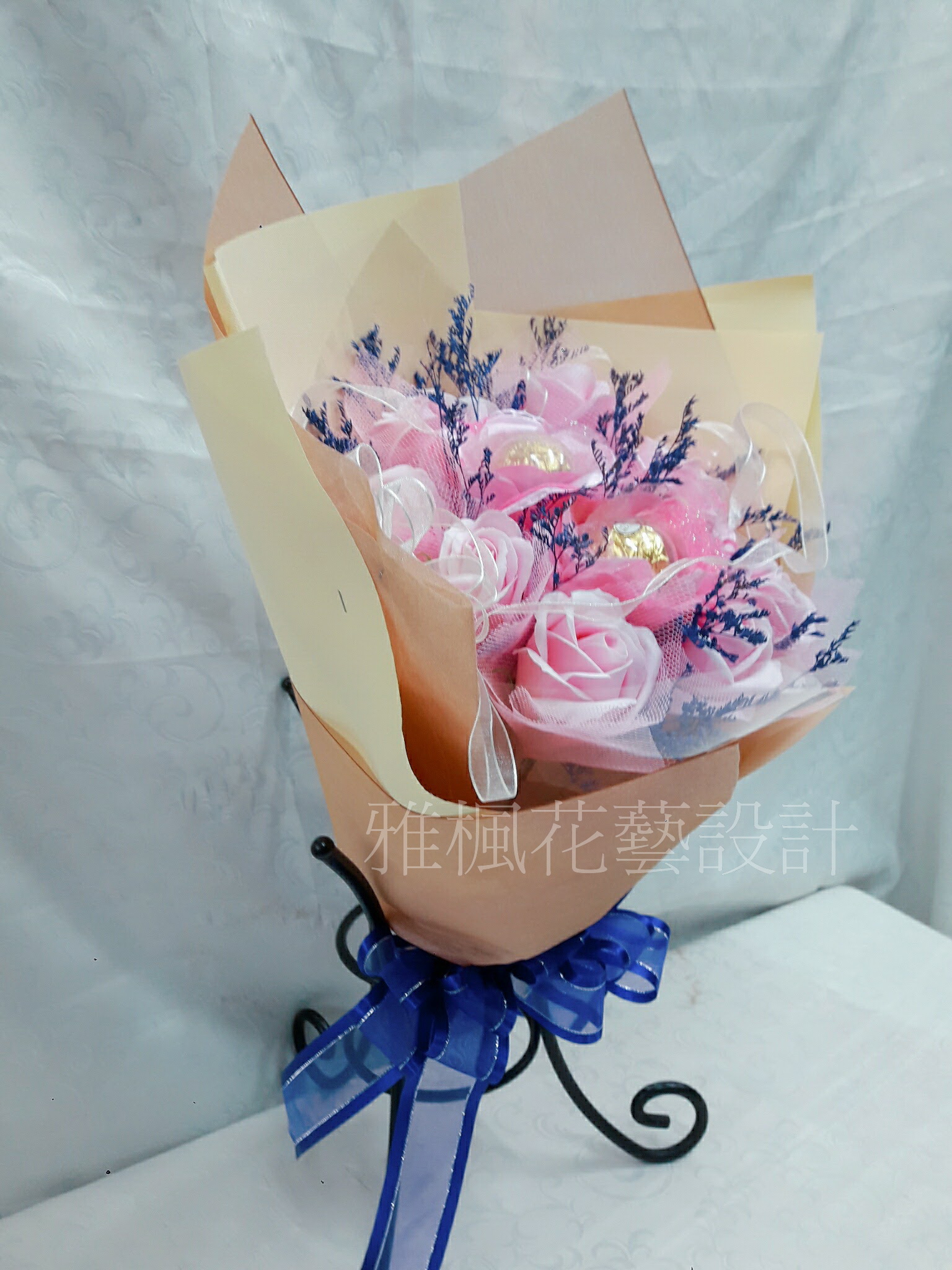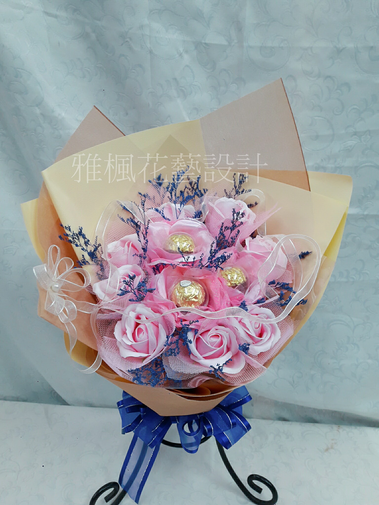 金莎巧克力3顆,玫瑰花8朵,紫色小花,紗網,高質感包裝紙,緞帶