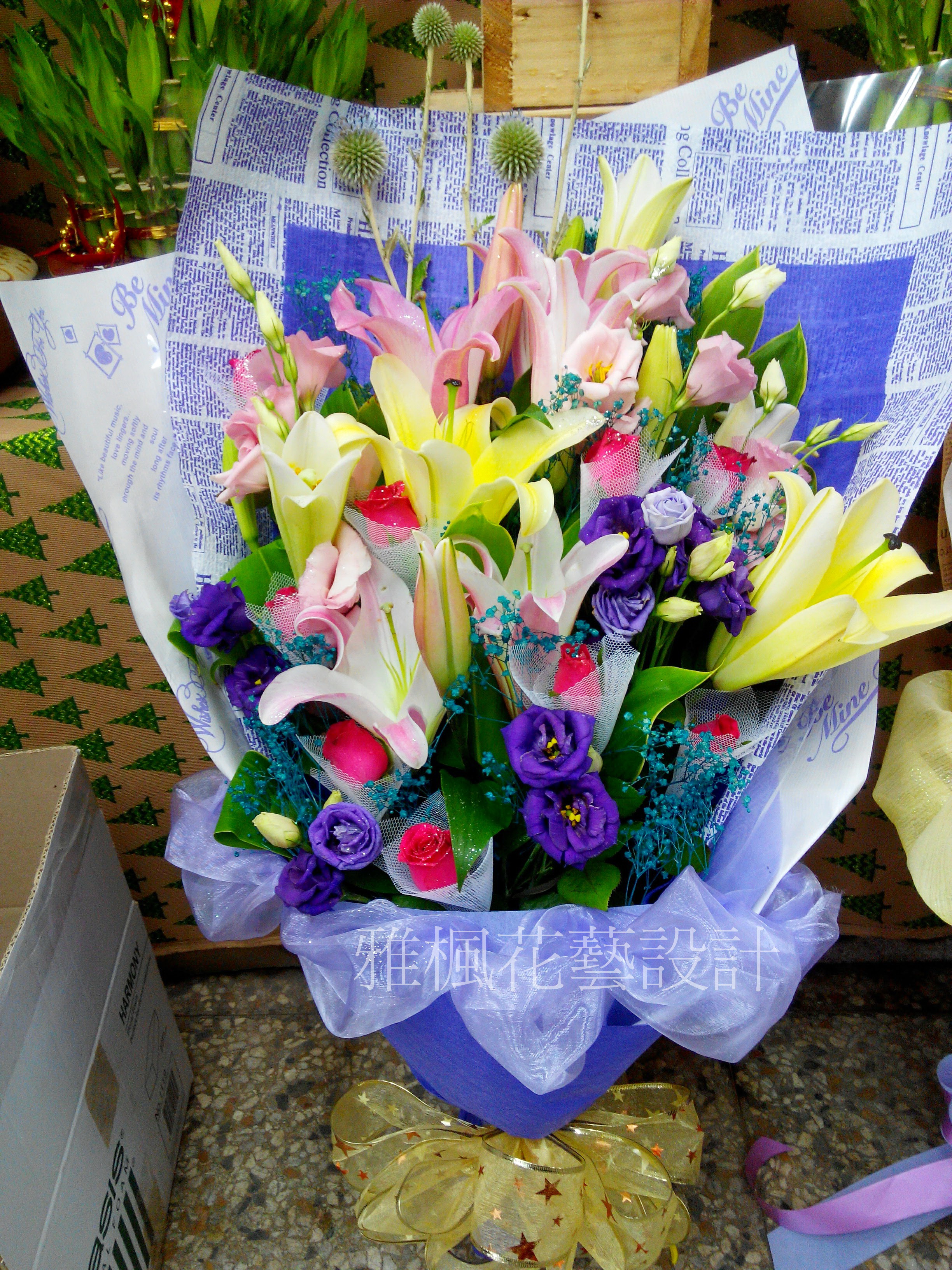 規格: 桔梗,玫瑰,滿天星,百合,小花,葉材,紗網,緞帶,高質感包裝紙