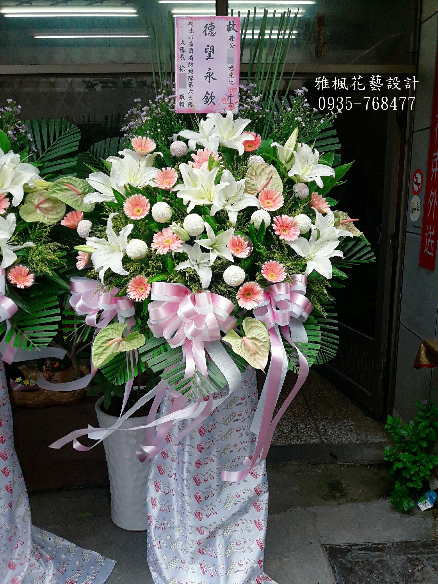 產品名稱:白色追思大型藝術花藍喪事花籃_南投雲林花店專人專車送達